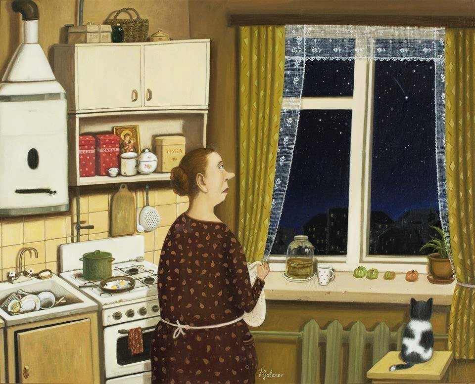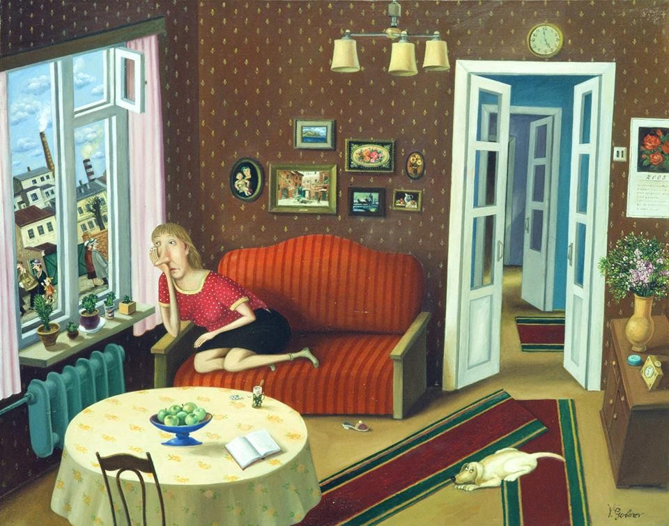 На его картинах — множество действующих лиц, деталей и предметов, как в коммуналке, заваленной вещами нескольких поколений жильцов. Но, как заметила одна поклонница таланта художника, здесь “много всего, но ничего лишнего”. Убери хоть одну деталь — и картина осиротеет. (автор статьи- Вероника Черкасова).